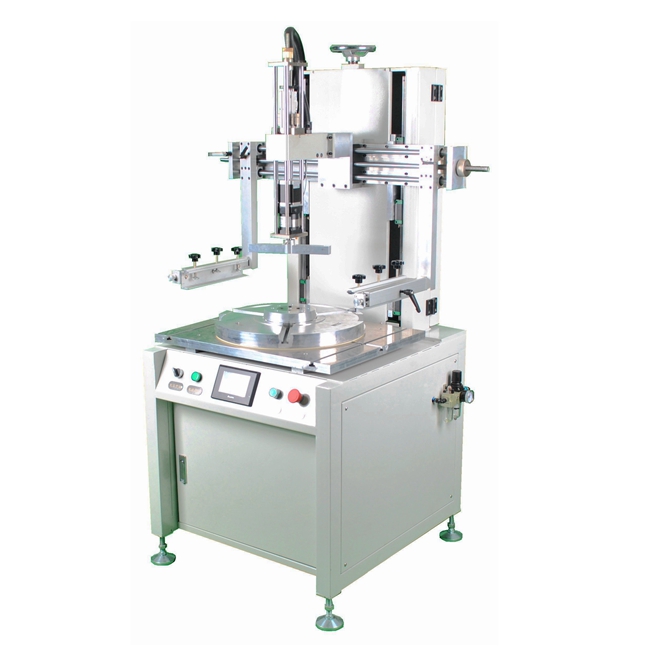 針對印刷面下凹的圓盤形產(chǎn)品,普通的絲印機(jī)平移運(yùn)動的刮刀無法完成印刷。